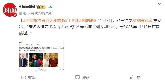 据封面新闻,著名表演艺术家、《西游记续集》沙僧扮演者刘大刚先生,��񀙓日在京病逝,终�岁。
